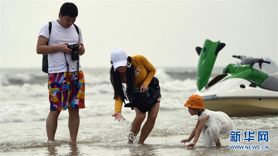 這是來自重慶的游客在銀灘戲水(4月18日攝)。 新華社記者張愛林攝