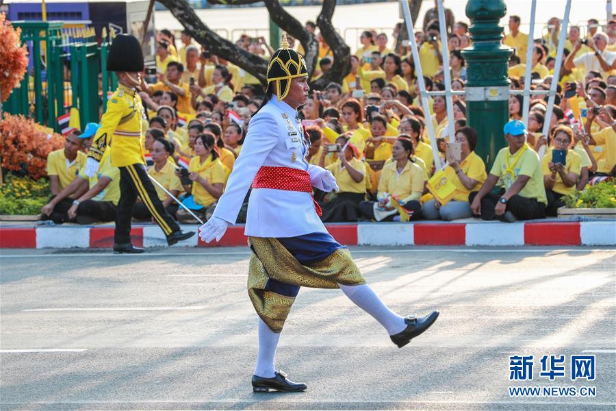 5月5日,儀仗隊(duì)在曼谷大王宮附近舉行的泰國(guó)國(guó)王加冕典禮巡游上列隊(duì)前進(jìn)。 新華社記者 張可任 攝