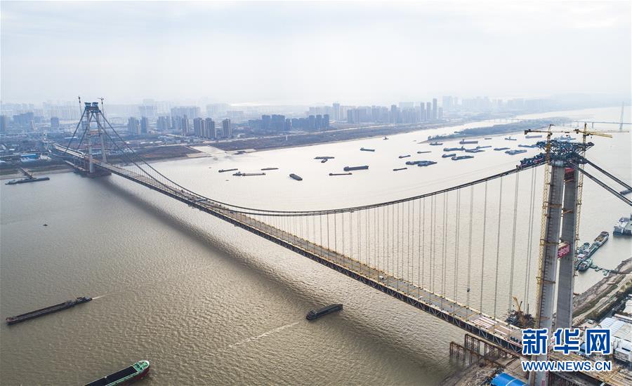 12月29日,武漢楊泗港長(zhǎng)江大橋順利合龍(無(wú)人機(jī)拍攝)。新華社記者 肖藝九 攝