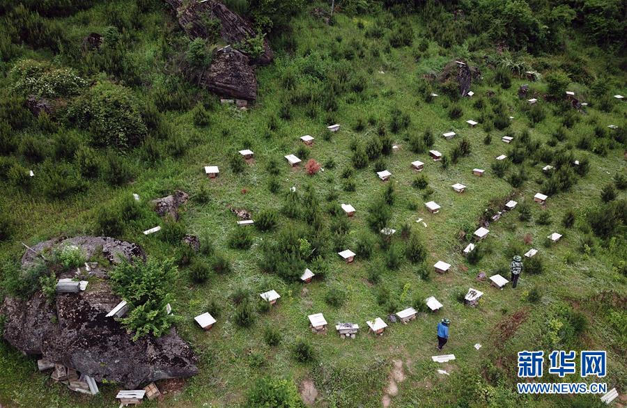 5月10日,在甘肅省隴南市徽縣大河店鎮(zhèn)硬灣村,蜂農查看蜂箱情況(無人機拍攝)。 甘肅省隴南市徽縣大河店鎮(zhèn)硬灣村位于秦巴山區(qū)深處,2017年,在當?shù)卣姆龀窒?,龍崖老巢蜜養(yǎng)殖農民專業(yè)合作社成立,蜂農們將傳統(tǒng)養(yǎng)蜂技藝和現(xiàn)代加工方式相結合,并通過電商等渠道打開銷路,有效帶動了當?shù)刎毨Т迕衩撠氈赂弧D壳罢麄€合作社共有蜂箱2000余個,每箱每年可帶來三四千元的收入。 新華社記者 馬寧 攝