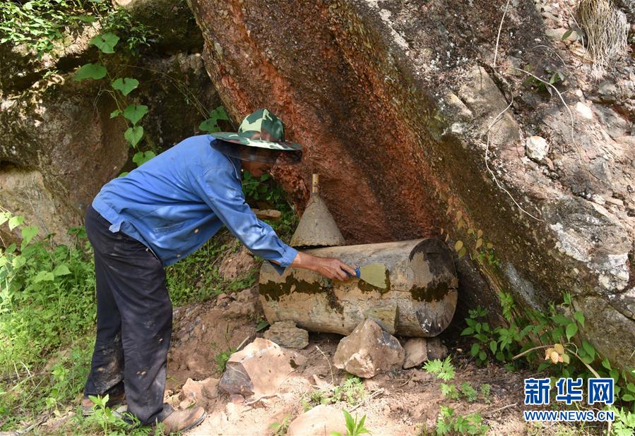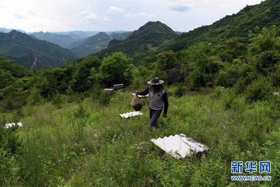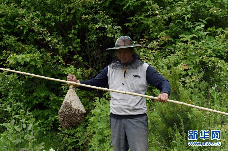5月10日,在甘肅省隴南市徽縣大河店鎮(zhèn)硬灣村,蜂農(nóng)周仲頤在收蜂。 甘肅省隴南市徽縣大河店鎮(zhèn)硬灣村位于秦巴山區(qū)深處,2017年,在當(dāng)?shù)卣姆龀窒拢堁吕铣裁垧B(yǎng)殖農(nóng)民專業(yè)合作社成立,蜂農(nóng)們將傳統(tǒng)養(yǎng)蜂技藝和現(xiàn)代加工方式相結(jié)合,并通過電商等渠道打開銷路,有效帶動了當(dāng)?shù)刎毨Т迕衩撠氈赂?。目前整個合作社共有蜂箱2000余個,每箱每年可帶來三四千元的收入。 新華社記者 馬寧 攝