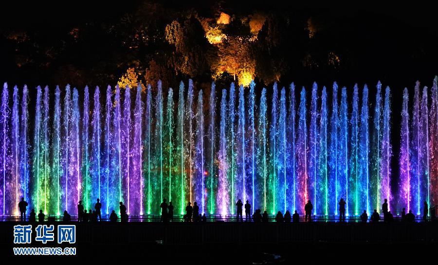 5月14日,游客在奧林匹克森林公園觀看水幕燈光秀。 當晚,一場“空間光影秀”在北京上演。 新華社記者 鞠煥宗 攝