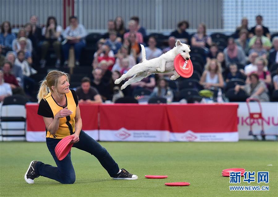 5月19日,在德國多特蒙德舉行的寵物展上,訓(xùn)犬師沃爾夫帶著愛犬進(jìn)行“狗接飛盤”表演。 為期三天的德國多特蒙德“狗和貓”寵物展19日落幕。寵物展期間,人們帶著自己的“萌寵”來到會場,參與寵物跳水、舞蹈、選美等趣味比賽,并與其他寵物愛好者及展商交流互動。 新華社記者逯陽攝
