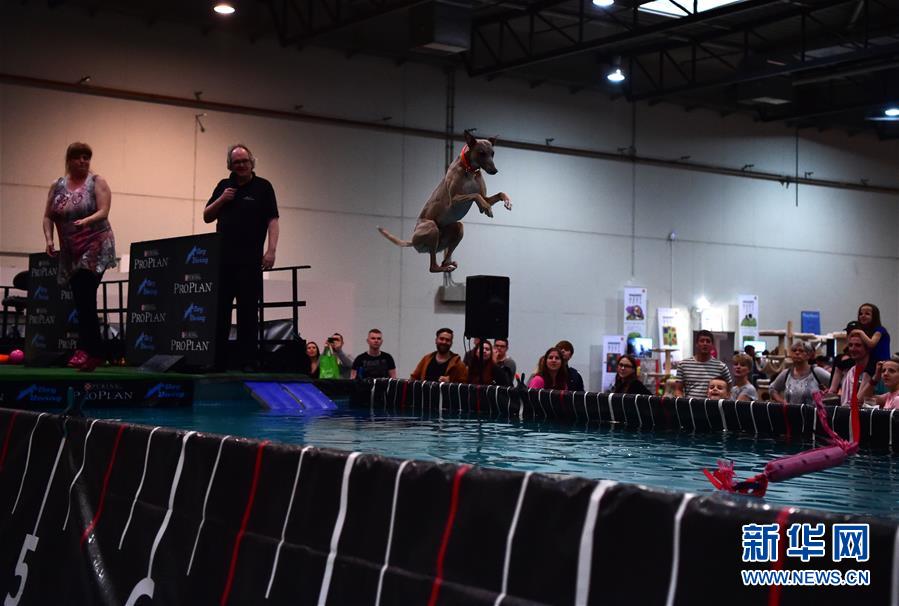 5月19日,在德國多特蒙德舉行的寵物展上,一只獵犬參加跳水比賽。 為期三天的德國多特蒙德“狗和貓”寵物展19日落幕。寵物展期間,人們帶著自己的“萌寵”來到會場,參與寵物跳水、舞蹈、選美等趣味比賽,并與其他寵物愛好者及展商交流互動(dòng)。 新華社記者逯陽攝