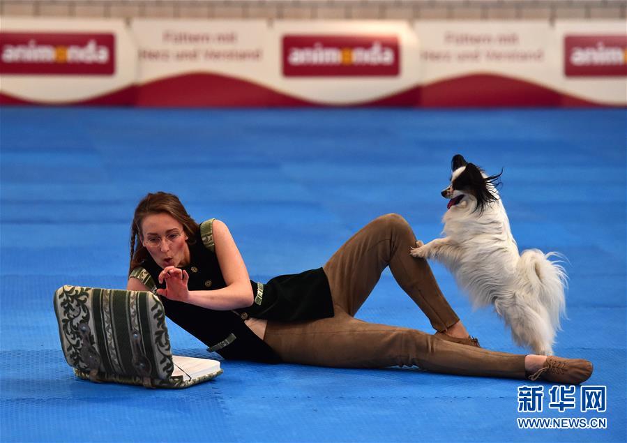 5月19日,在德國多特蒙德舉行的寵物展上,訓(xùn)犬師沃爾夫帶著愛犬進(jìn)行“狗接飛盤”表演。 為期三天的德國多特蒙德“狗和貓”寵物展19日落幕。寵物展期間,人們帶著自己的“萌寵”來到會場,參與寵物跳水、舞蹈、選美等趣味比賽,并與其他寵物愛好者及展商交流互動(dòng)。 新華社記者逯陽攝