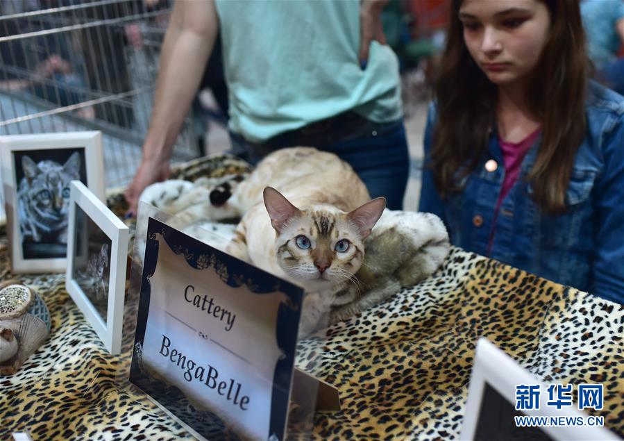 這是5月19日在德國多特蒙德舉行的寵物展上拍攝的一只孟加拉貓。 為期三天的德國多特蒙德“狗和貓”寵物展19日落幕。寵物展期間,人們帶著自己的“萌寵”來到會場,參與寵物跳水、舞蹈、選美等趣味比賽,并與其他寵物愛好者及展商交流互動(dòng)。 新華社記者逯陽攝