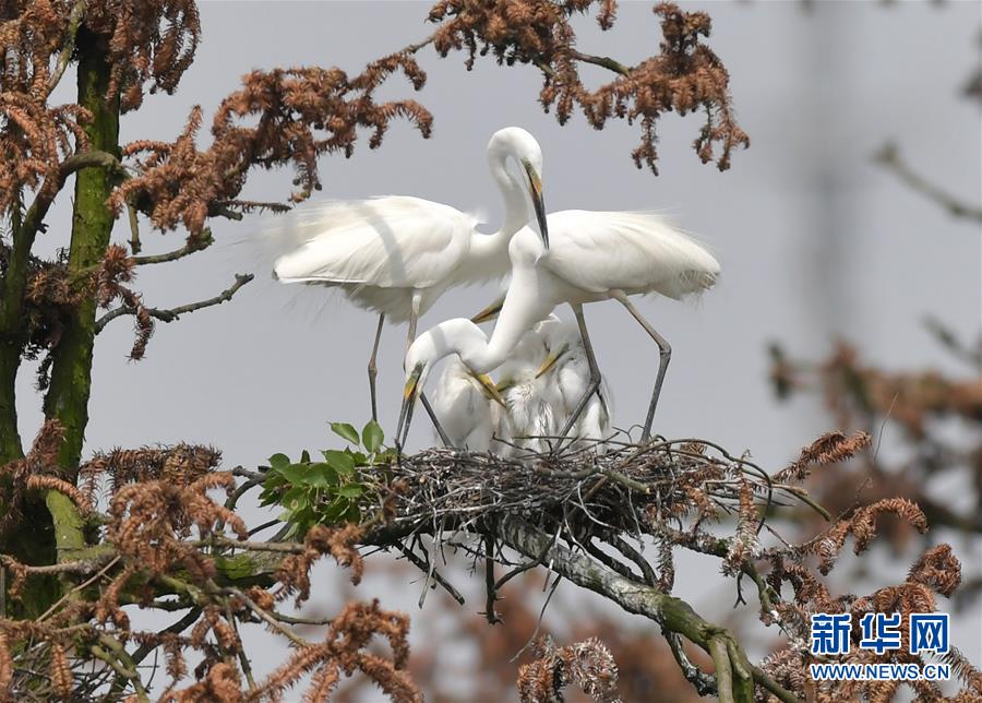 在江西省南昌市新建區(qū)象山森林公園內(nèi),白鷺和自己的雛鳥在一起(5月21日攝)。 近日,在江西省南昌市新建區(qū)象山森林公園內(nèi),已安家筑巢的大批鷺鳥陸續(xù)孵化出了后代。象山森林公園有著“鷺鳥王國”的美譽(yù),生態(tài)環(huán)境良好,每年都會吸引白鷺、蒼鷺、夜鷺等種類的鷺鳥飛抵棲息和繁衍后代。 新華社記者 彭昭之 攝