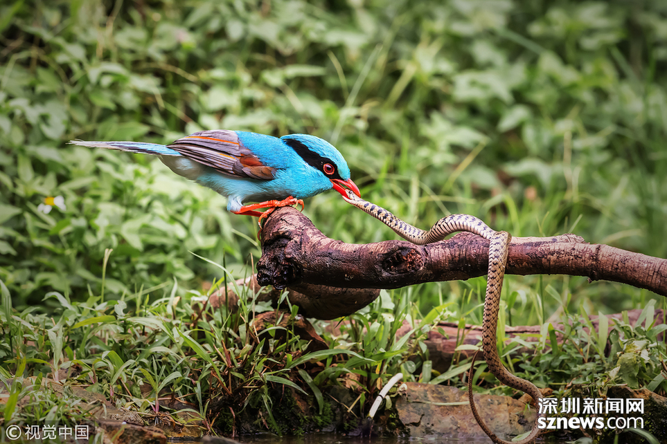2018年7月18日,廣東東莞,藍(lán)綠鵲與蛇的地盤(pán)爭(zhēng)斗。