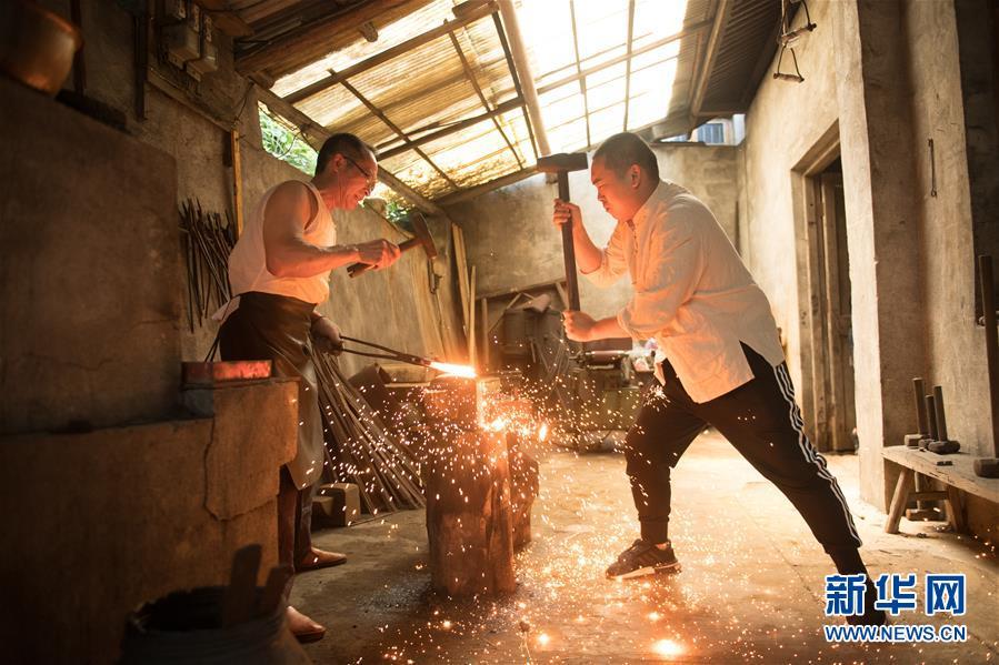 5月21日,鄭國榮和兒子鄭劍威在“古越劍鋪”對坯料進(jìn)行鍛打。 鄭國榮,1964年生于浙江龍泉,已經(jīng)跟寶劍打了30多年的交道。1982年他作為學(xué)徒進(jìn)入龍泉市寶劍廠,1994年劍廠改制后,成立了工作室“古越劍鋪”,開始獨(dú)立的鑄劍生涯。 從兵器到精神的象征,鄭國榮一直對寶劍懷有敬畏之心。在他的工作室,一把寶劍,從理念形成、圖紙設(shè)計、備料到制作整合一般需要兩三個月。自劍鋪成立以來,他已帶了20多個徒弟,如今都成了有名的鑄劍師。他的兒子也在畢業(yè)后跟隨他鑄劍,目前已基本掌握了全流程的鑄造技藝。 新華社記者翁忻旸攝