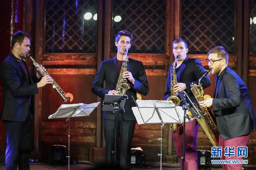 5月26日,凱比亞特樂隊成員在音樂會上表演。 當(dāng)日,作為第十九屆“相約北京”藝術(shù)節(jié)系列演出之一,西班牙凱比亞特樂隊薩克斯四重奏音樂會在北京Temple東景緣上演。 新華社記者 張玉薇 攝