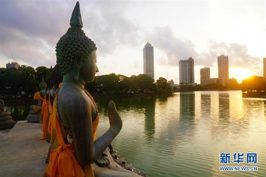 這是夕陽下的斯里蘭卡科倫坡水中廟佛像(5月27日攝)。 在科倫坡貝拉湖上有一座木造樓閣——水中廟。木造建筑上面覆蓋著藍(lán)瓦,外圍環(huán)繞著線條優(yōu)美的佛像。樓閣外高臺(tái)上供奉的佛像,與不遠(yuǎn)處的高層建筑相互映照。祥和寧靜的水中廟已成為人們修心、祈福的重要場(chǎng)所。 新華社記者唐璐攝