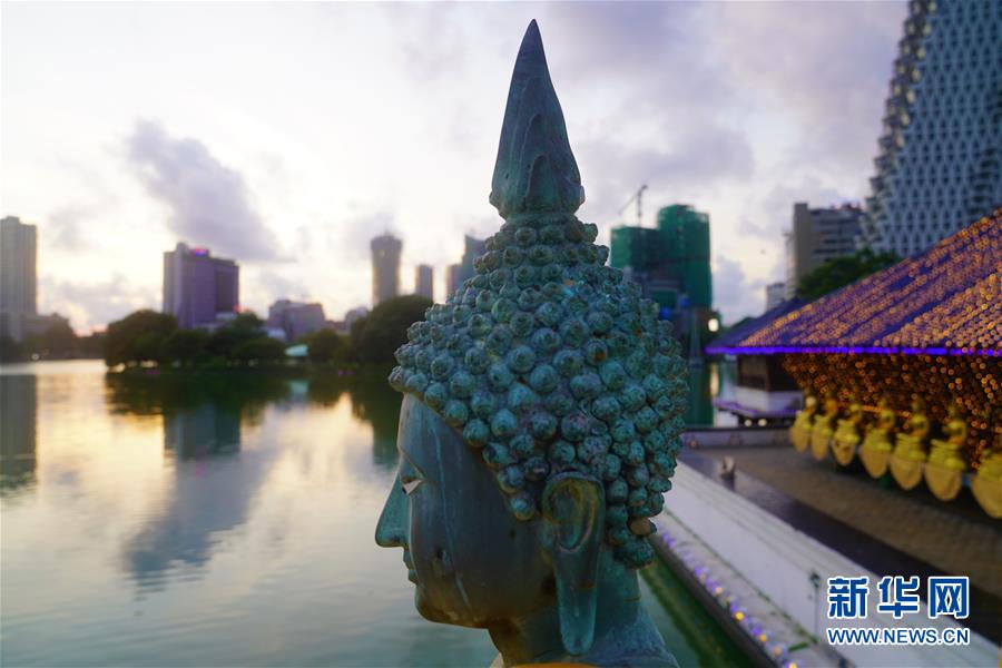 這是夕陽下的斯里蘭卡科倫坡水中廟佛像(5月27日攝)。 在科倫坡貝拉湖上有一座木造樓閣——水中廟。木造建筑上面覆蓋著藍(lán)瓦,外圍環(huán)繞著線條優(yōu)美的佛像。樓閣外高臺(tái)上供奉的佛像,與不遠(yuǎn)處的高層建筑相互映照。祥和寧靜的水中廟已成為人們修心、祈福的重要場(chǎng)所。 新華社記者唐璐攝