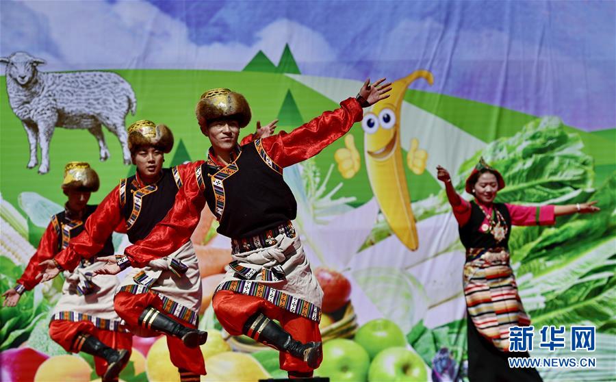 5月28日,演員在白朗縣第九屆果蔬采摘節(jié)上表演。 近日,西藏日喀則市白朗縣1.46萬畝瓜果蔬菜喜獲豐收。百姓們?cè)诳h里的豐登廣場載歌載舞,慶祝白朗縣第九屆果蔬采摘節(jié)。 新華社記者 張汝鋒 攝