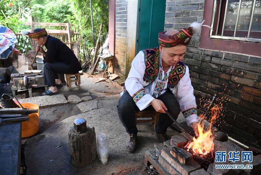 5月29日,在廣西融水苗族自治縣融水鎮(zhèn),銀匠陳志元(右)在生炭火準(zhǔn)備打造銀飾。