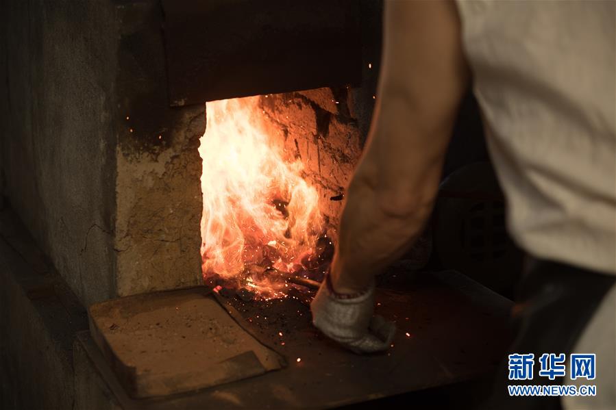 5月21日,鄭國榮在“古越劍鋪”煉制坯料。 新華社記者 翁忻旸 攝