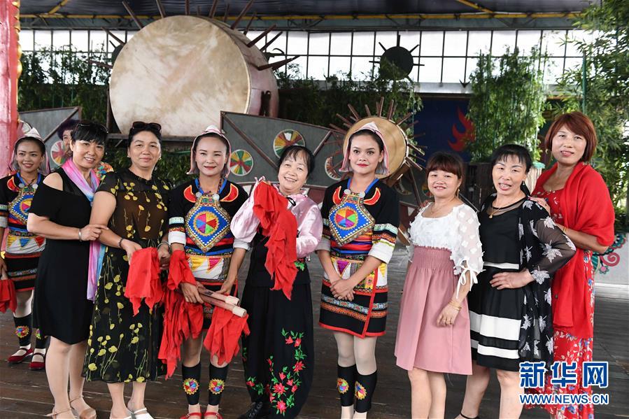 游客與基諾族大鼓舞演員合影(6月1日攝)。 在云南省西雙版納傣族自治州景洪市基諾山基諾族鄉(xiāng)的基諾族村寨,每天的基諾大鼓舞表演吸引了眾多游客前來觀賞體驗,帶動了基諾族群眾就業(yè)和增收?;Z族大鼓舞蘊涵豐富的歷史文化內(nèi)涵,已被列入國家級非物質(zhì)文化遺產(chǎn)保護名錄。 新華社記者 楊宗友 攝