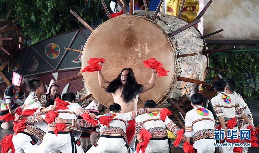 基諾族演員在表演大鼓舞(6月1日攝)。 在云南省西雙版納傣族自治州景洪市基諾山基諾族鄉(xiāng)的基諾族村寨,每天的基諾大鼓舞表演吸引了眾多游客前來觀賞體驗,帶動了基諾族群眾就業(yè)和增收?;Z族大鼓舞蘊涵豐富的歷史文化內(nèi)涵,已被列入國家級非物質(zhì)文化遺產(chǎn)保護名錄。 新華社記者 楊宗友 攝