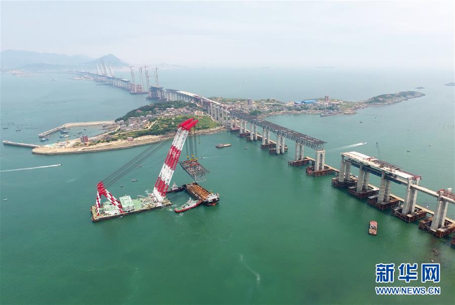 5月12日,“大橋海鷗號”起重船在吊裝一孔簡支鋼桁梁(無人機(jī)拍攝)。新華社記者 林善傳 攝