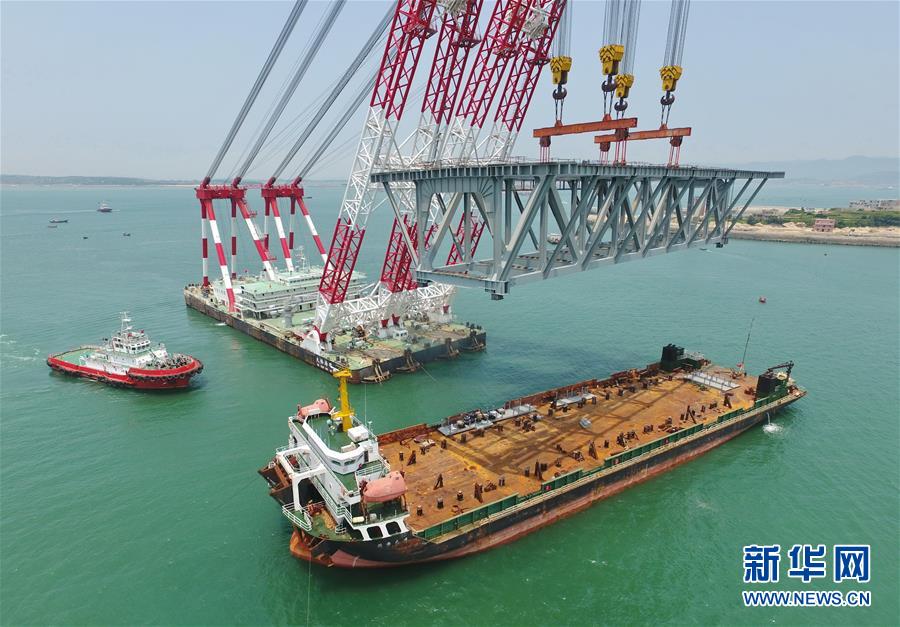 5月12日,“大橋海鷗號(hào)”起重船在吊裝一孔簡支鋼桁梁(無人機(jī)拍攝)。新華社記者 林善傳 攝