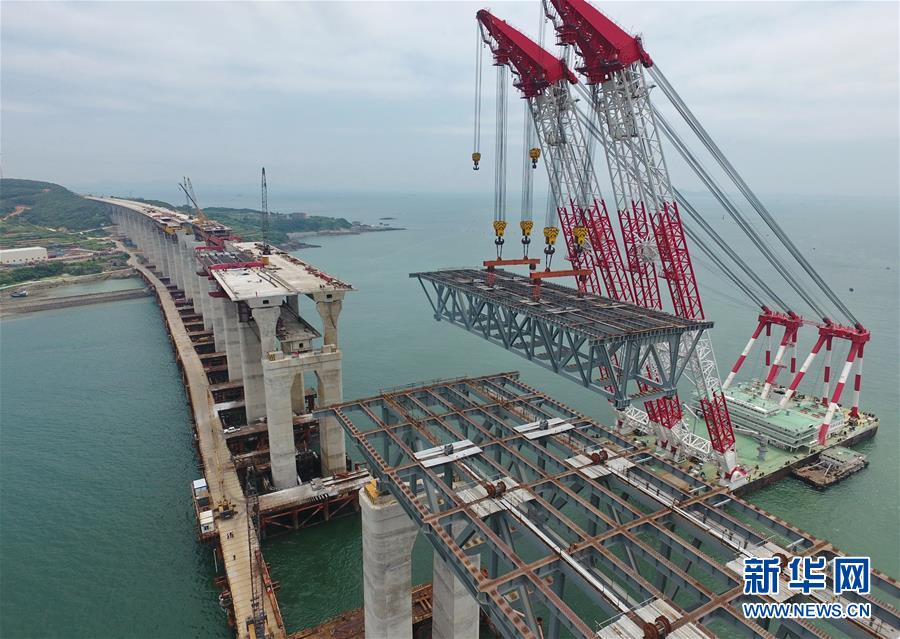 5月12日,“大橋海鷗號(hào)”起重船在吊裝一孔簡(jiǎn)支鋼桁梁(無(wú)人機(jī)拍攝)。新華社記者 林善傳 攝