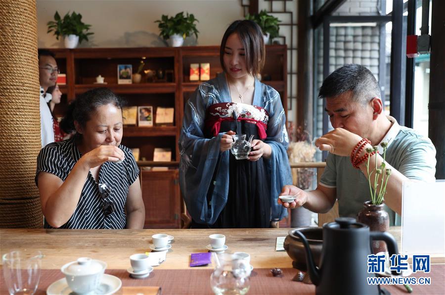 6月9日,在成都寬窄巷子古今茶語,兩位來自太原的游客參與品香猜茶互動(dòng)游戲。新華社記者 江宏景 攝