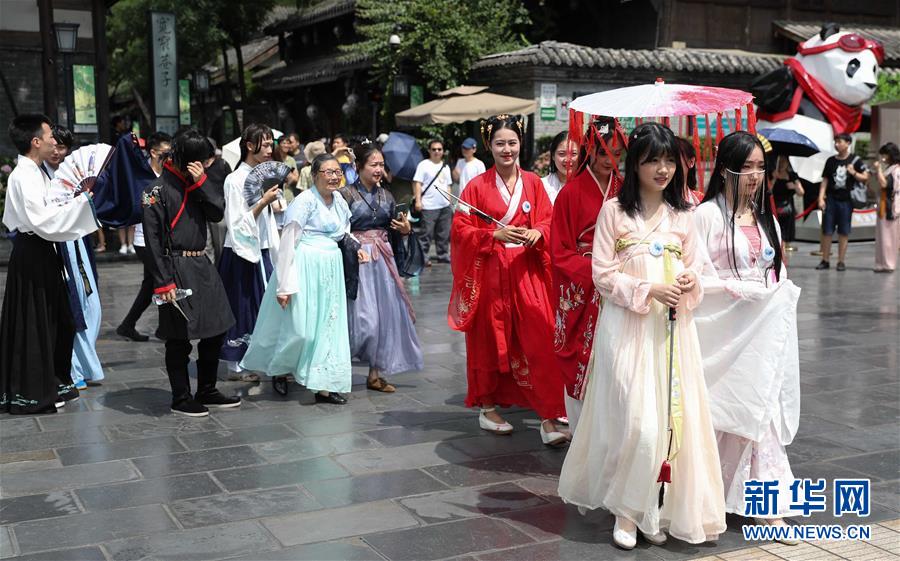 6月9日,漢服愛好者在成都寬窄巷子巡游,宣傳“聞香識(shí)寬窄”主題活動(dòng)。新華社記者 江宏景 攝