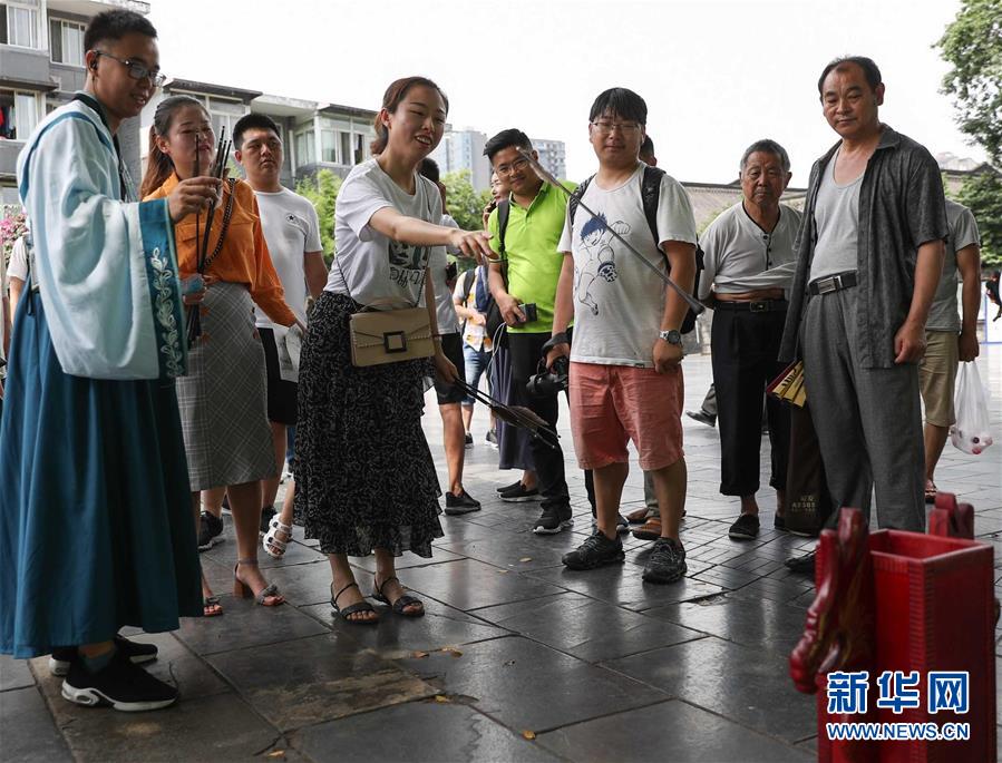 6月9日,在成都寬窄巷子,游客排隊參與投壺祈香游戲。新華社記者 江宏景 攝