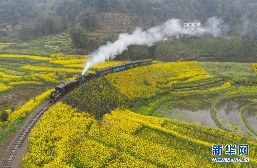 3月20日,一列嘉陽小火車在油菜花叢中穿行(無人機(jī)拍攝)。