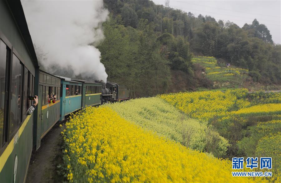 3月20日,乘坐嘉陽小火車的游客在拍攝風(fēng)景。