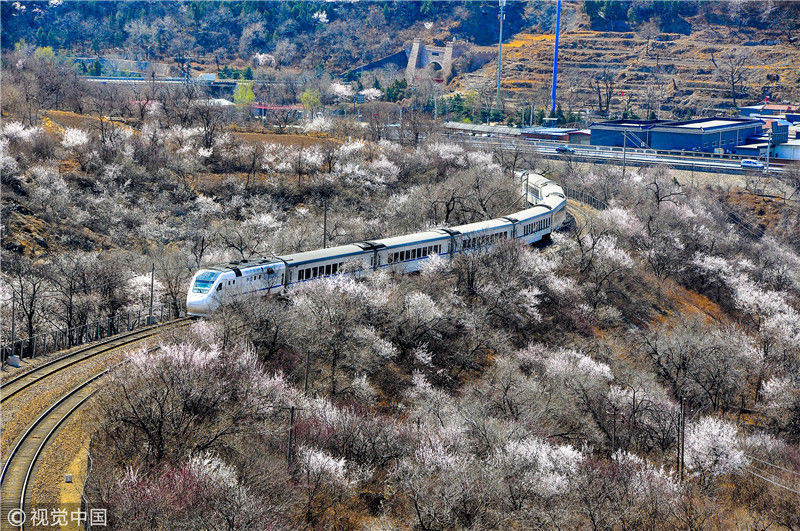 2019年3月22日,北京居庸關(guān)附近的山花盛開(kāi),S2線(xiàn)列車(chē)穿行在花海之中,構(gòu)成一幅美麗的畫(huà)面。