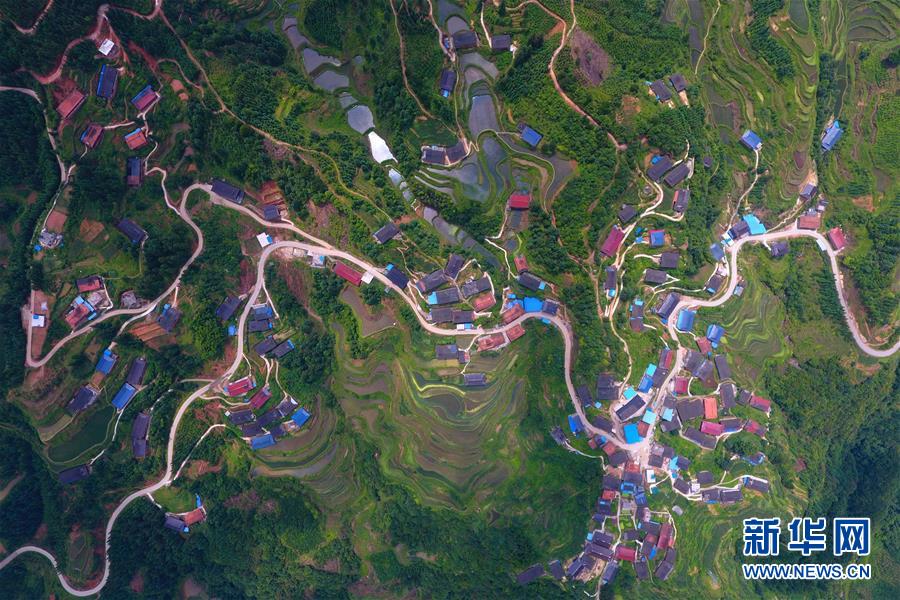 在融水苗族自治縣桿洞鄉(xiāng)黨鳩村下黨鳩屯,道路已經(jīng)修到家家戶戶門前(6月21日無人機拍攝)。新華社記者 黃孝邦 攝