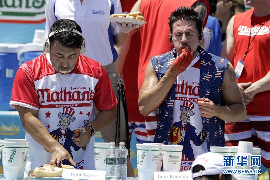7月4日,在美國(guó)紐約康尼島,選手參加吃熱狗大賽。 新華社記者 李木子 攝