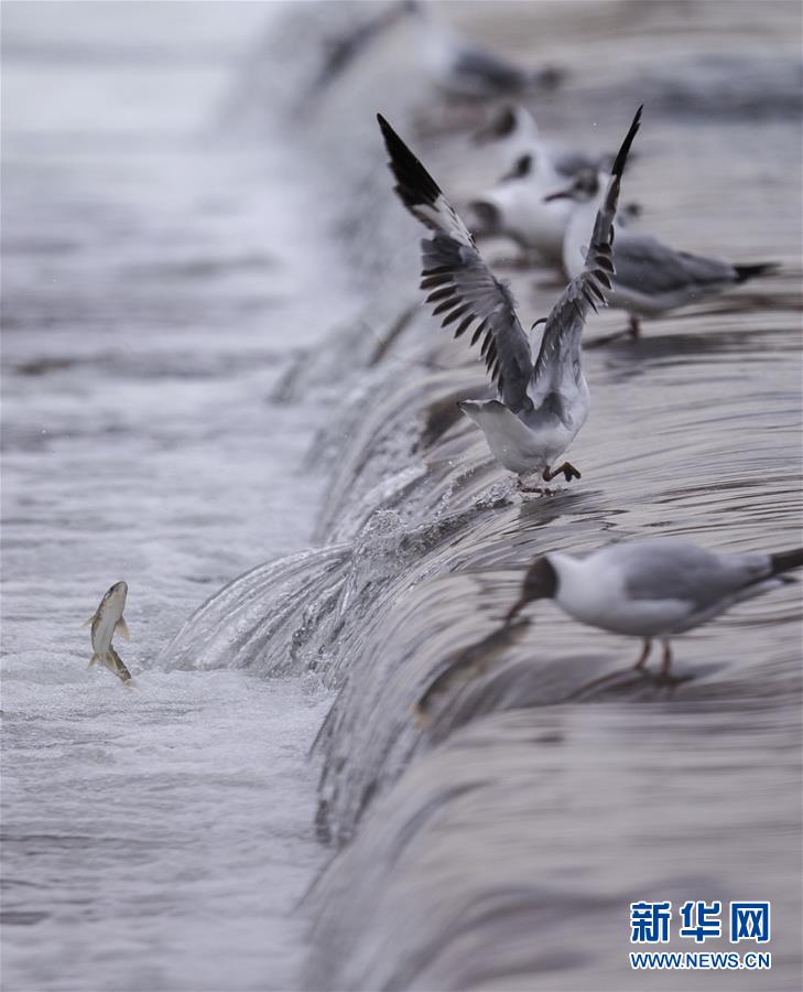 7月6日,在青海省剛察縣沙柳河里,幾只棕頭鷗等待捕捉躍起的湟魚。 新華社記者 費茂華攝