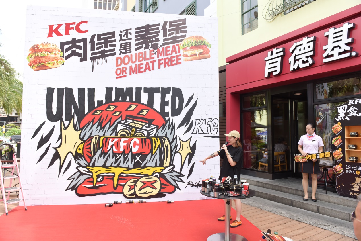 “肯德基是我非常喜歡的品牌,新潮、時尚。這一次與KFC的涂鴉合作,我在漢堡涂鴉的畫面中融入了像滑板、打碟機(jī)這樣的潮流元素,來演繹KFC厚菇堡這一款極具創(chuàng)新性的漢堡。用噴漆罐表現(xiàn)一整塊芝士厚菇,一口咬下能噴出濃郁的芝士;火焰燃燒的造型代表漢堡中肆意的醬汁,增加視覺沖擊感,呈現(xiàn)出一個沒有肉,但很real的霸氣素漢堡。”談及創(chuàng)作理念,ROCKLEE說道,“這種結(jié)合我覺得很有意義,一方面展現(xiàn)了涂鴉這種街頭文化多元的一面,另一方面也傳遞出KFC在漢堡界young OG的全新形象。”從創(chuàng)作到完工,整個過程都引來路人圍觀、拍照。從朋友圈看到消息的潮人又不斷向此聚集、花式打卡。