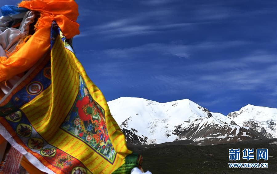 7月10日,阿尼瑪卿雪山山下掛著經(jīng)幡。 新華社記者 張宏祥 攝