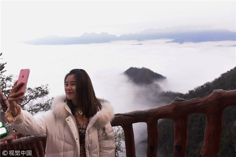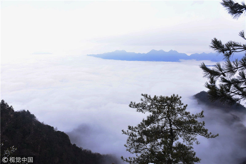 2019年3月3日,陜西商洛,位于鎮(zhèn)安縣的塔云山景區(qū)云海翻騰,宛如仙境。袁景智/視覺中國 編輯/陳進