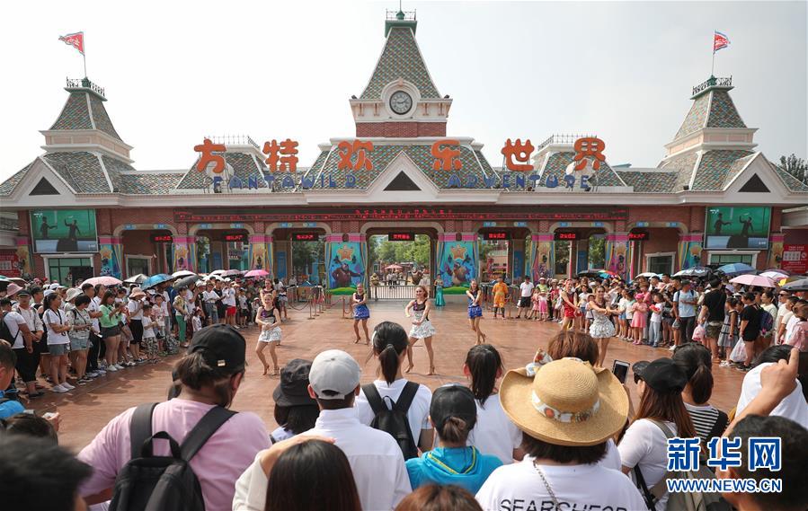 7月31日,列娜(前排左)在沈陽(yáng)方特歡樂(lè)世界門前表演舞蹈。
