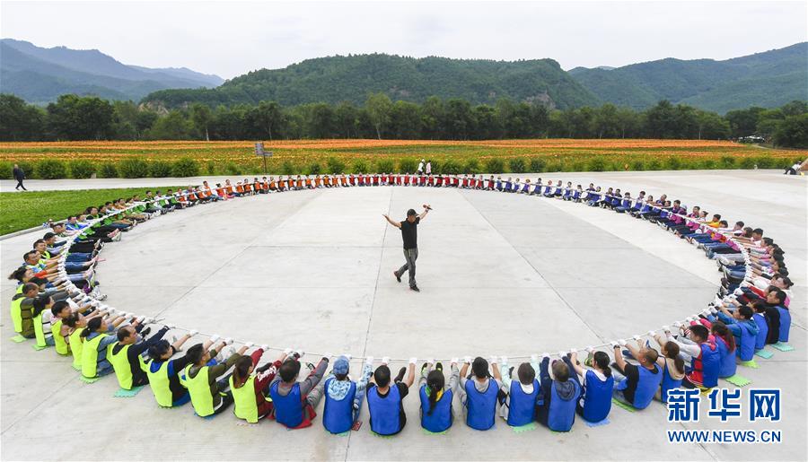 8月8日,游客在伊春市九峰山養(yǎng)心谷景區(qū)進(jìn)行集體游戲活動(dòng)。 時(shí)值八月,黑龍江省伊春市林區(qū)空氣清新,涼爽宜人,吸引眾多游客。 新華社記者李曉果攝