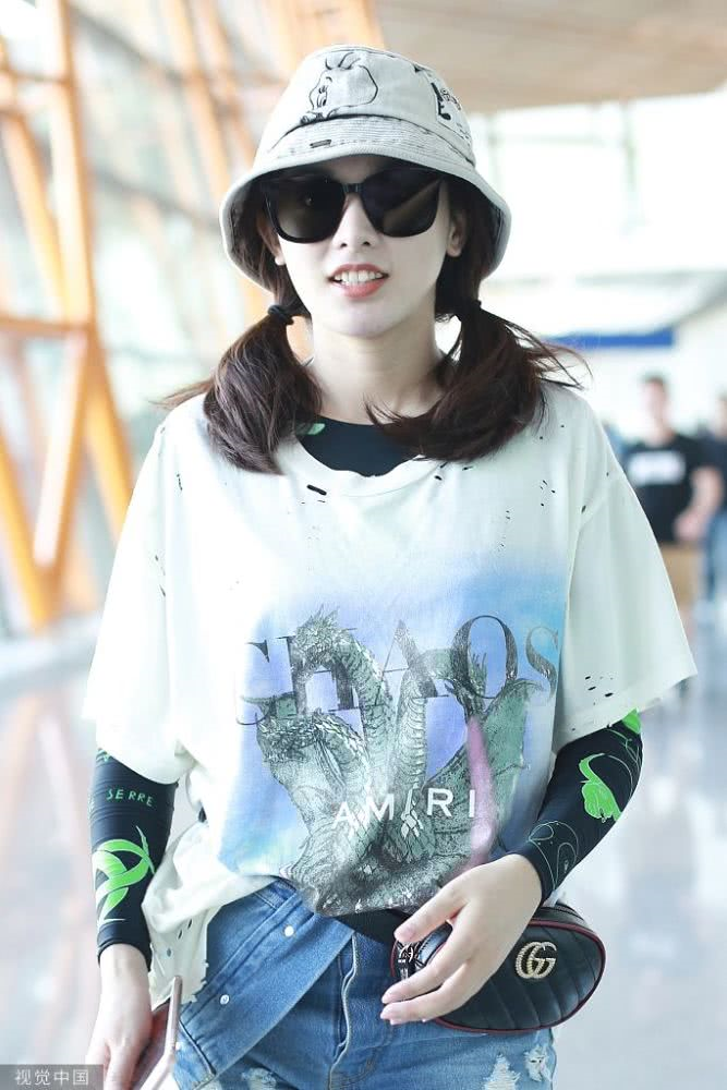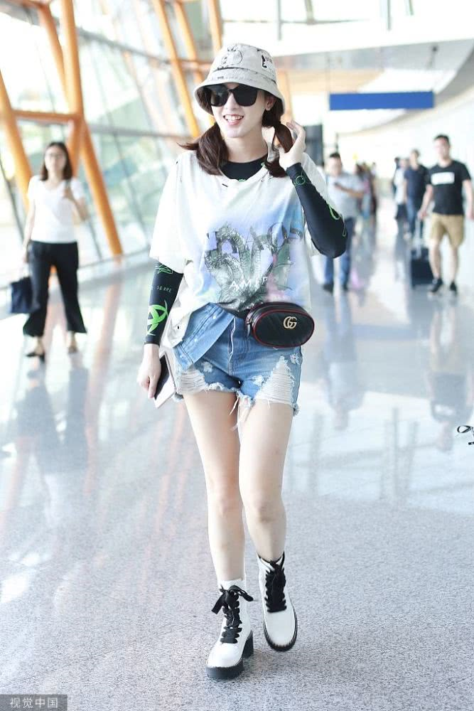 內(nèi)地女星彭小苒現(xiàn)身機(jī)場(chǎng),穿印花T恤牛仔短褲,白色馬丁靴很時(shí)髦