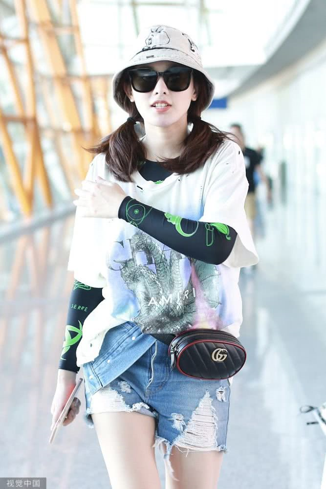 內(nèi)地女星彭小苒現(xiàn)身機(jī)場(chǎng),穿印花T恤牛仔短褲,白色馬丁靴很時(shí)髦