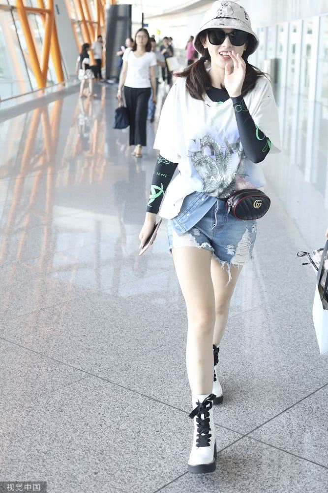 內地女星彭小苒現(xiàn)身機場,穿印花T恤牛仔短褲,白色馬丁靴很時髦