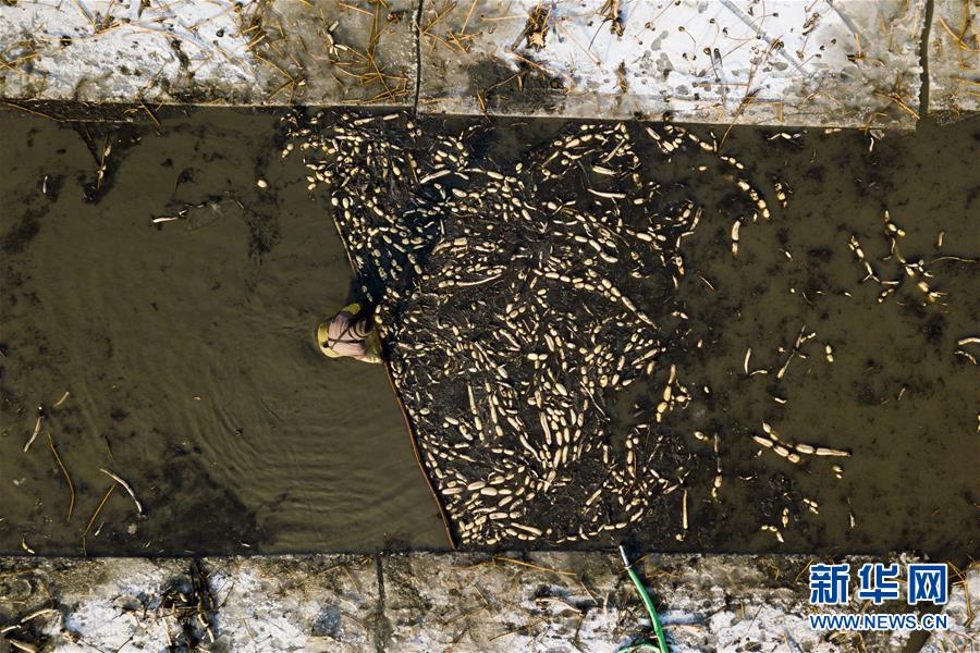 2月1日,在雄安新區(qū)安新縣東向陽(yáng)村的一處藕塘,一名挖藕工將挖出來(lái)的藕推向塘邊(無(wú)人機(jī)航拍)。新華社記者沈伯韓攝