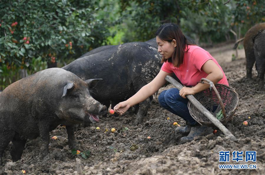 8月20日,康丹丹在果園內喂豬吃海棠果。