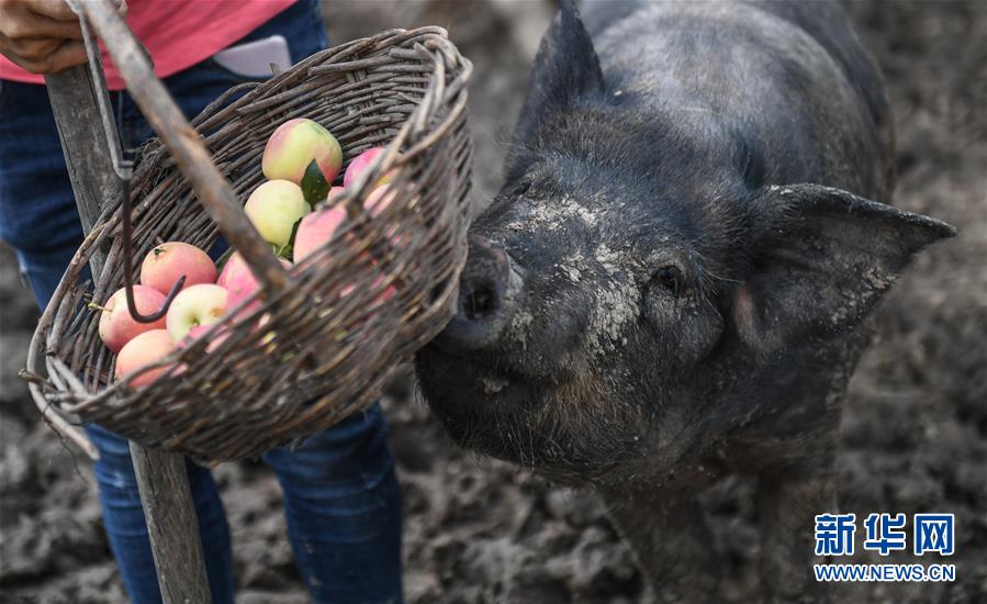 8月20日,康丹丹在接受采訪時(shí),一頭水果香豬來(lái)?yè)屖乘@子里的海棠果。新華社記者 王昊飛 攝