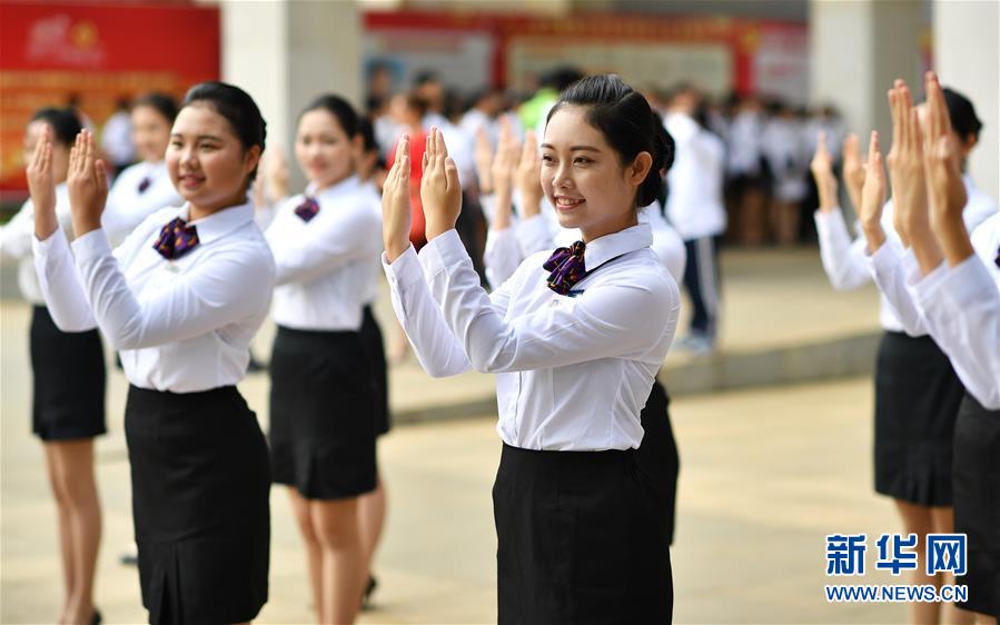 海南省旅游學(xué)校禮儀隊的學(xué)生在上禮儀課(2018年4月20日攝)。新華社記者郭程攝