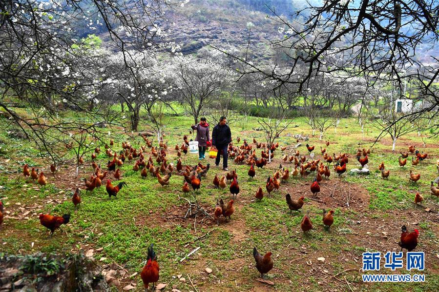 龍革雄(右)和妻子羅桂枝去喂雞(2017年2月28日攝)。新華社記者 黃孝邦 攝