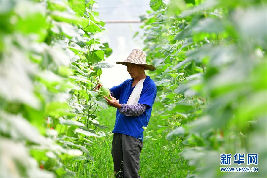 在廣西融安縣大良鎮(zhèn)古蘭村古蘭屯大棚基地,62歲的黃顯亮查看甜瓜生長(zhǎng)情況(8月18日攝)。黃顯亮是大棚基地的技術(shù)員,每個(gè)月有3000多元的工資,已于2018年實(shí)現(xiàn)脫貧。 新華社記者 黃孝邦 攝