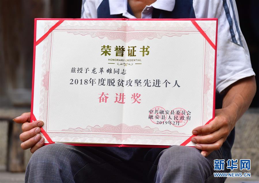 龍革雄在展示榮譽(yù)證書(shū)(8月16日攝)。新華社記者 黃孝邦 攝