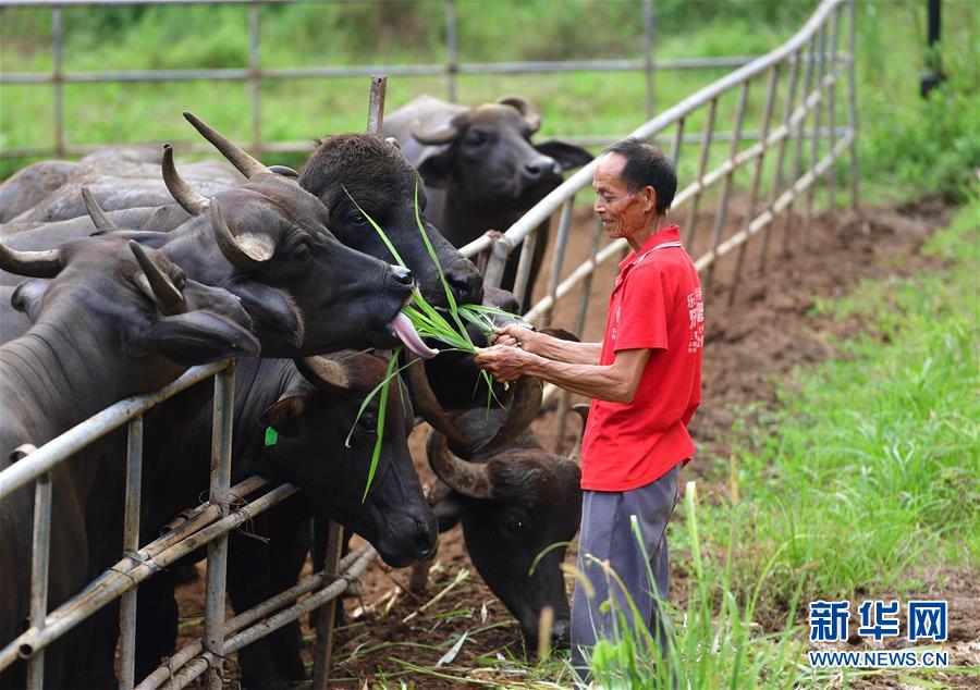在廣西融安縣大良鎮(zhèn)古蘭村古蘭屯養(yǎng)?;?,68歲的韋肇翠在喂牛(8月18日攝)。韋肇翠是養(yǎng)牛基地的飼養(yǎng)員,每個(gè)月有2800元的工資。 新華社記者 黃孝邦 攝