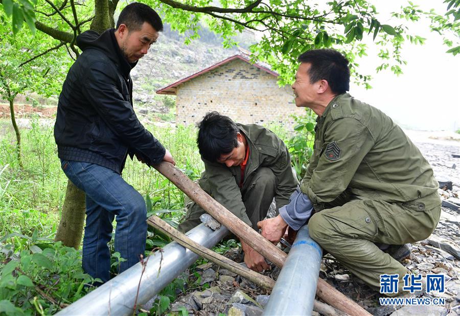 龍革雄(右)和堂兄弟們?cè)诩茉O(shè)引水管道(2017年4月7日攝)。新華社記者 黃孝邦 攝